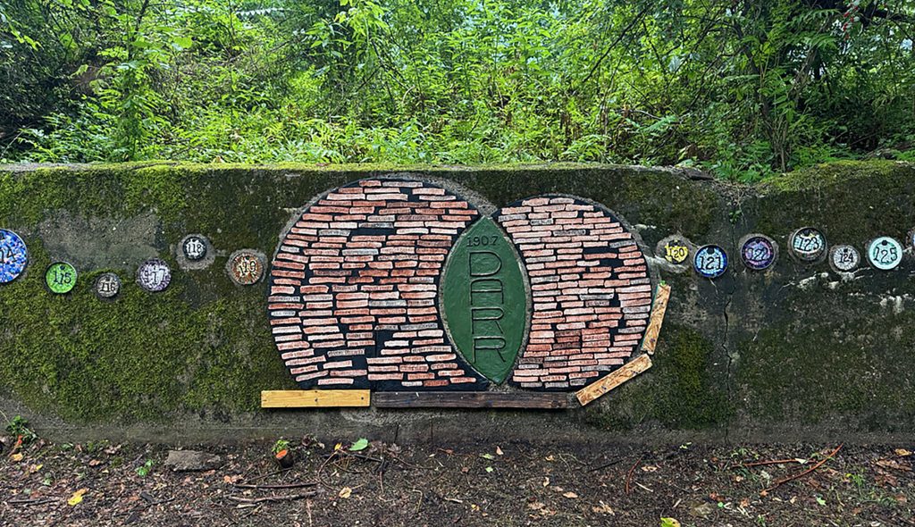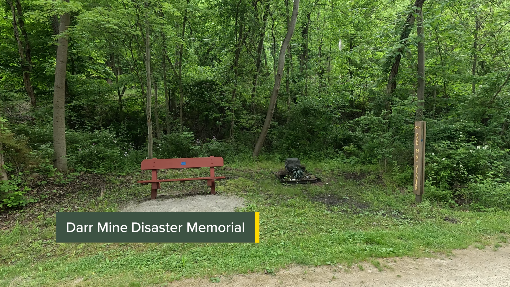 Each of the plaques is numbered and represents each of the 239 men who were lost on December 19, 1907 during the Darr Mine explosion that occurred a couple of miles just west of the project, in the old Darr mine. Check out the accompanying video on this segment to see the whole wall.