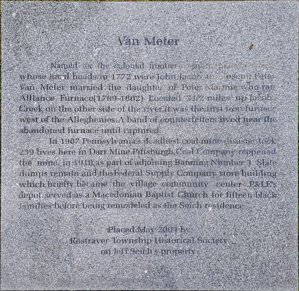 Shortly after leaving the Darr Mine Disaster marker, we come into the little patch town of Van Meter, so named because John Van Meter once operated a ferry service around here in the 1790s.