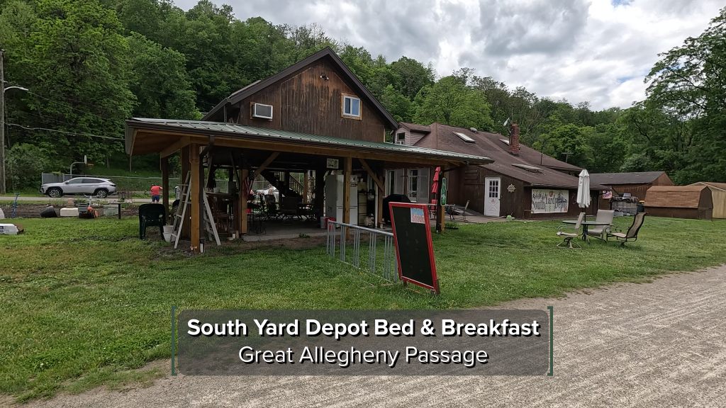Right along the trail is the South Depot Bed and Breakfast. Now a private residence, the property used to be the Pittsburgh & Lake Erie Railroad’s Van Meter station (sometimes listed as “Jacobs Creek station”).